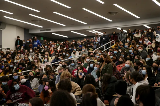 The event attracted hundreds of students cramming into Room 1-105 of Lilly Hall, as well as thousands who logged on via Zoom to attend the town hall.