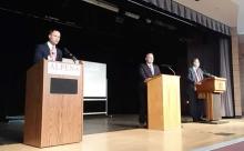From left, former speaker Tom Lenard, Rep. Ryan Berman and Matthew DePerno take part in the GOP attorney general candidate debate at Alpena Community College in Alpena, Mighigan, on February 18, 2022.