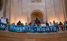 A banner reading "parental rights" is seen at a rally at the Minnesota State Capitol in Saint Paul, Minnesota, on February 3, 2022.