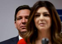 Florida Gov. Ron DeSantis listens as his wife Casey DeSantis speaks during a press conference at the University of Miami Health System's Don Soffer Clinical Research Center on May 17, 2022, in Miami, Florida. JOE RAEDLE / GETTY IMAGES