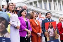 Front row from left, Representatives Veronica Escobar, Judy Chu, House Speaker Nancy Pelosi, Jimmy Gomez and Carolyn Maloney sing "God Bless America," outside the U.S. Capitol before the House voted to pass the Bipartisan Safer Communities Act on June 24, 2022. Tom Williams / CQ-Roll Call, Inc via Getty Images