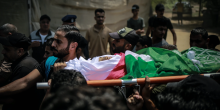Mourners carry the body of Palestinian Khalil Abu Hamadeh at his funeral ceremony at Jabalia camp in the northern Gaza Strip on Aug. 7, 2022.