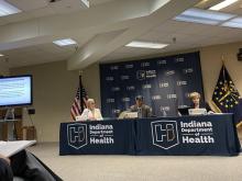 Governor’s Public Health Commission co-chair and former state Sen. Luke Kenley summarizes some of the body’s recommendations on Aug. 4, 2022. (Leslie Bonilla Muñiz/Indiana Capital Chronicle)