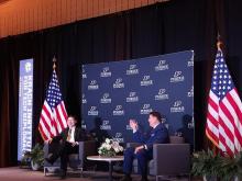 Purdue alum and Krach Institute co-founder Keith Krach and President Mung Chiang laugh and discuss technology during a talk Thursday.