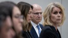 Physician Caitlin Bernard, left, sits between attorneys John Hoover and Alice Morical on May 25, 2023, before a hearing in front of the Indiana licensing board. Mykal McEldowney/The Indianapolis Star via AP