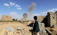 A boy looks at dust rising from the site of airstrikes in Saada, Yemen, on February 27, 2018. ,Naif Rahma / Reuters