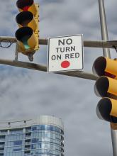Indianapolis installed no-turn-on-red signs this past summer in the downtown despite the Indiana General Assembly banning the city from prohibiting right turns on red lights. (Photo/Marilyn Odendahl)