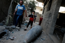 Palestinians look at an unexploded bomb dropped by an Israeli F-16 warplane on Gaza City's Rimal neighbourhood on May 18, 2021. (Majdi Fathi/NurPhoto via Getty Images)