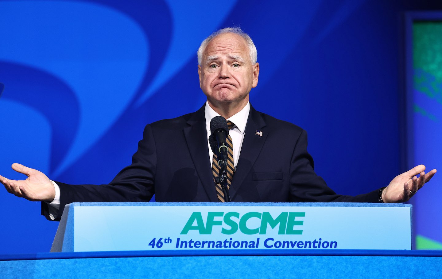 Tim Walz speaks at the 46th International Convention of the American Federation of State, County and Municipal Employees (AFSCME) at the Los Angeles Convention Center on August 13, 2024.