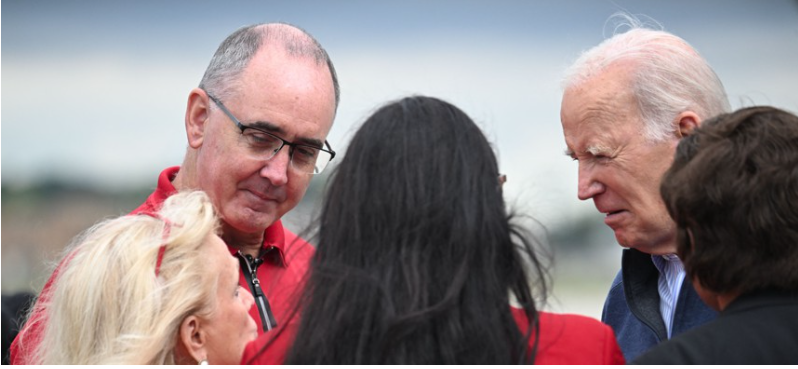 President Joe Biden is welcomed by United Auto Workers President, Shawn Fain, second from left, and Rep. Debbie Dingell, D-Mich., left, on arrival at Detroit Metropolitan Wayne County Airport in Romulus, Michigan, on Sept. 26, 2023. JIM WATSON / GETTY IMAGES