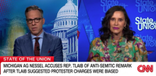 Referring to Michigan Attorney General Dana Nessel’s prosecution of pro-Palestine protesters, Jake Tapper (CNN, 9/22/24) asserted that “Congresswoman Tlaib is suggesting that…she’s only doing it because she’s Jewish and the protesters are not.”