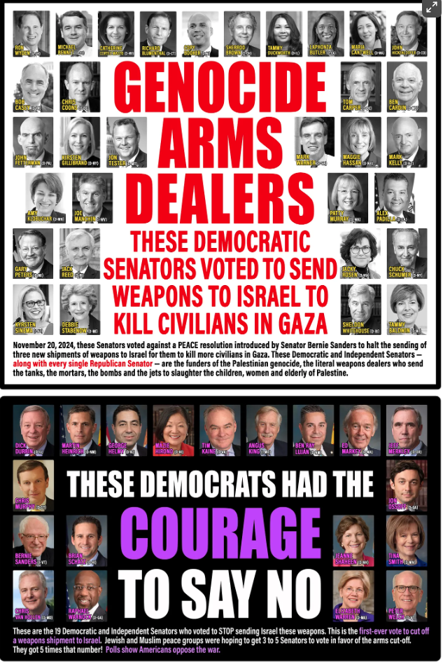 But something amazing happened exactly 10 days ago: 19 Democratic and Independent Senators stood up for the first time and voted to STOP the sending of three shipments of American weapons to Israel. It was a never-before rebuke to warn Netanyahu that millions of Americans have had enough of his slaughter of innocent civilians. Of course, to Netanyahu, Palestinians are not “innocent” because, well, they don’t exist. The 1977 manifesto/ charter of his Likud Party makes this very clear: