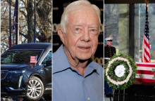 The hearse carrying Jimmy Carter's body, Jimmy Carter, Jimmy Carter's casket. PHOTO: MEGAN VARNER/GETTY;ALEX BRANDON / POOL / AFP