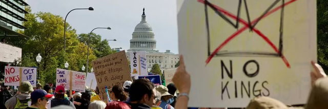 People participate in a “No Kings” national day of protest in Washington, DC, on October 18, 2025.