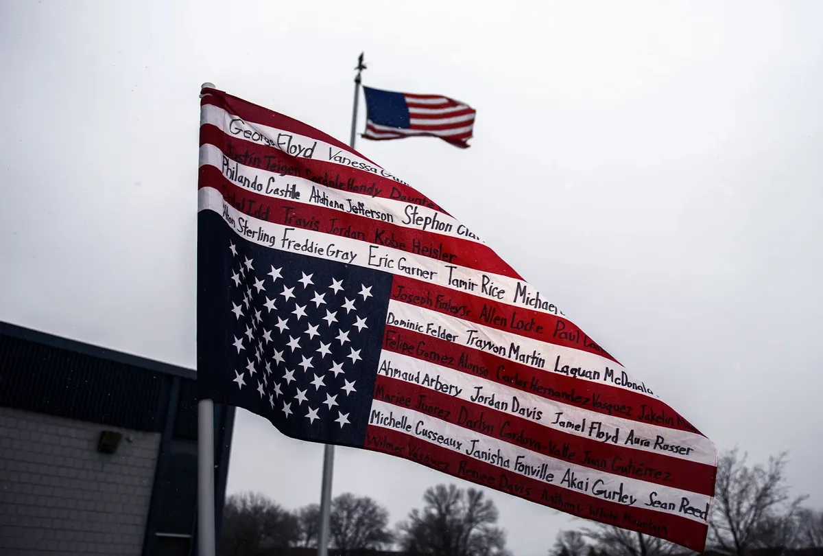 An upside-down American flag bearing the names of people killed by police is displayed during a protest on April 13, 2021 in Brooklyn Center, Minnesota. (Stephen Maturen/Getty Images)