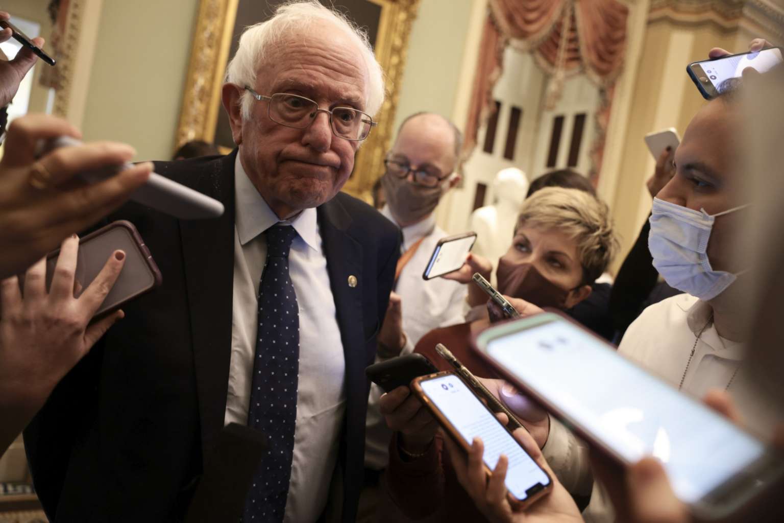 Sen. Bernie Sanders speaks with reporters after leaving a Senate Democrat luncheon on October 19, 2021, in Washington, D.C.